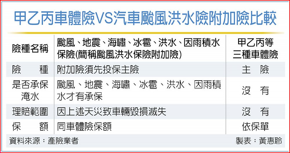 甲乙丙車體險VS汽車颱風洪水險附加險比較