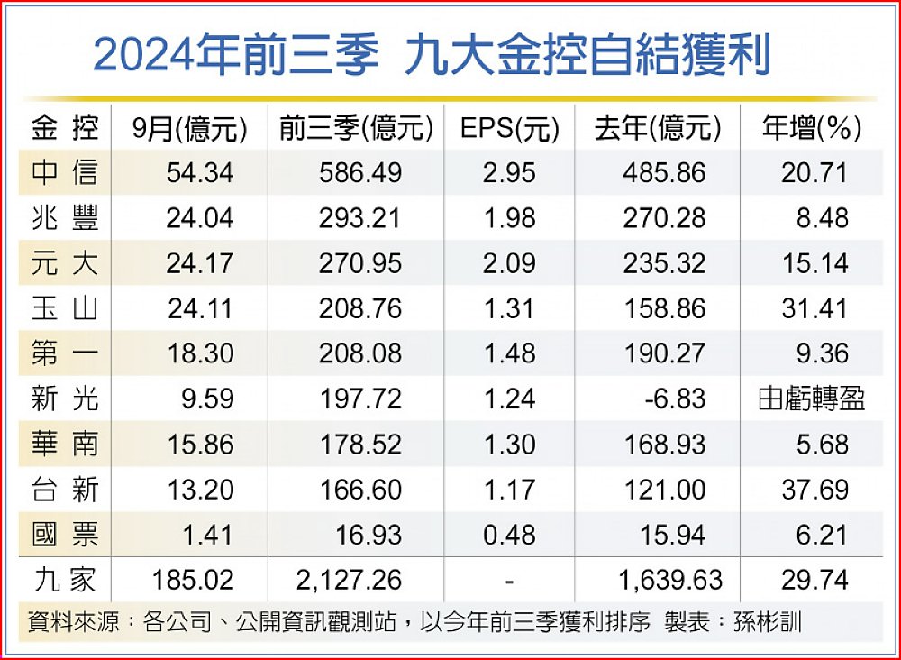 台新金前三季稅後純益166.6億元,年增37.7%,EPS為1.17元,主力獲利引擎台新銀業務獲利動能持續,資產品質維持穩健,前三季稅後純益為139.6億元,創歷年同期新高,年增15.4%。