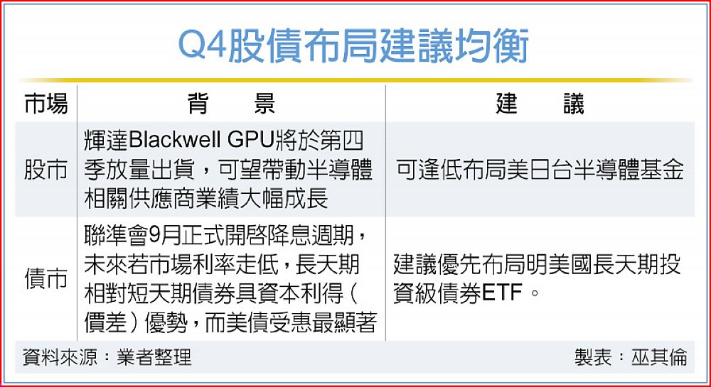 趙志中指出,債券基金方面,聯準會9月降息,為2020年3月來首次降息,正式開啟降息週期。長天期債券存續期間長,對利率敏感度更高,未來若市場利率走低,相對短天期債券具資本利得(價差)優勢,而美國債券受惠聯準會降息程度又最為顯著,建議優先布局明美國長天期投資級債券ETF。股票基金方面,輝達Blackwell GPU將於第四季放量出貨,可望帶動半導體相關供應商業績大幅成長,可逢低布局美日台半導體基金。