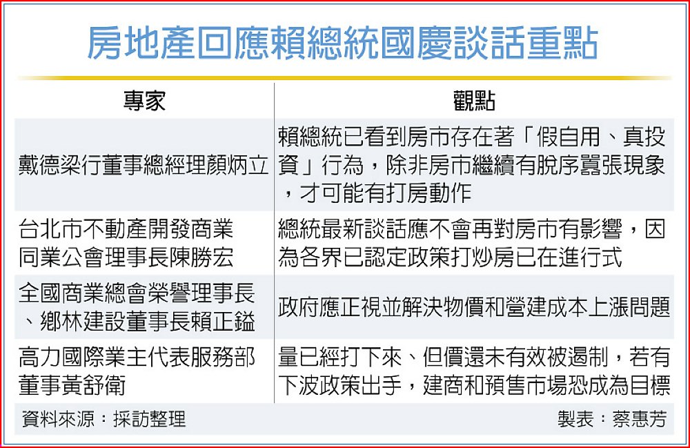 戴德梁行董事總經理顏炳立表示,賴總統國慶談話顯示他已經看到高房價的民怨,也看到房市存在著「假自用、真投資」行為,讓有些人貸不到錢,因此他宣示加快打炒房的效率、擴大對租屋族的照顧,展現他高度重視民怨、要落實居住正義的決心。但是,這不意味賴政府會有下一波打房政策,除非投資客還是跑出來、預售案又重現爆量成交等脫序囂張現象,賴政府將可能又有動作。
