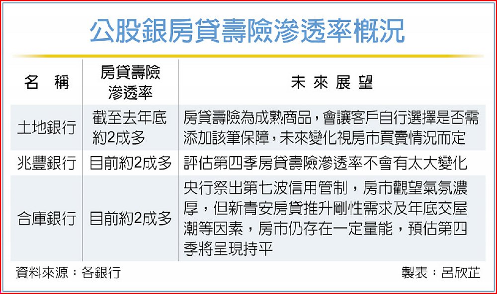 目前公股銀行房貸壽險滲透率多在約20~30%,土銀指出,房貸壽險為成熟商品,會讓客戶自行選擇是否需添加該筆保障,其實各家保單同質性很高,該業務變化主要為房市量能,未來變化視房市買賣情況而定;兆豐銀則評估,第四季房貸壽險滲透率不會有太大變化。