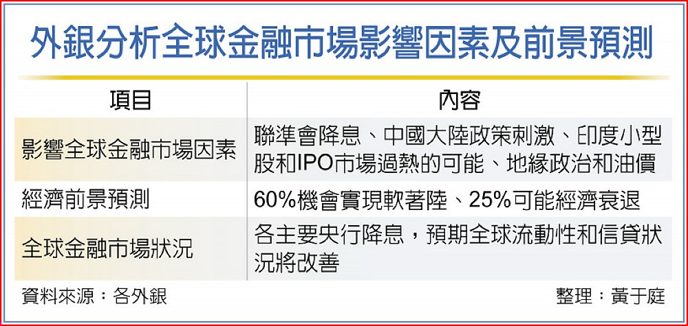 Fed宣布降息以來,市場情緒漸趨冷靜,主要外銀多認為Fed會與其他主要央行一起降息,美國經濟仍可能實現軟著陸,且全球流動性和信貸狀況將回升,對今年的金融市場帶來支撐。圖/美聯社