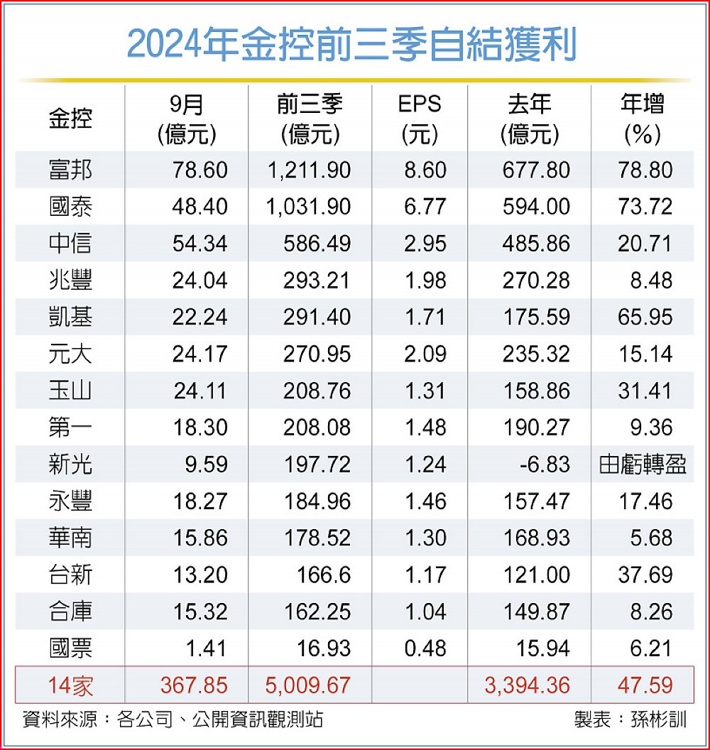 整體金控前三季獲利達5,009.67億元,超越2021年的15家金控4,992.62億元的紀錄,創下史上同期新高。今年前三季獲利較去年同期的3,394.36億元,年增率達47.59%。