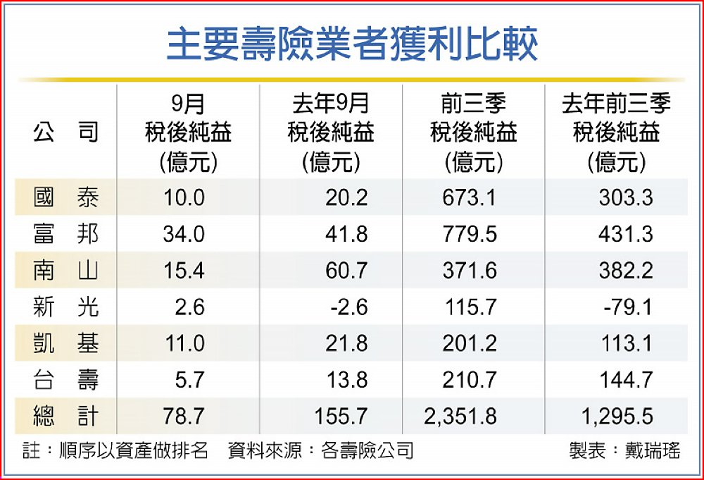 六大壽險即國泰、富邦、南山、新光、凱基、台壽。9月自結稅後純益78.7億元,相較8月僅賺5.3億元,顯見9月獲利動能回升許多,但因去年9月新台幣貶值、獲利基期高,呈現年減77億元或49%。