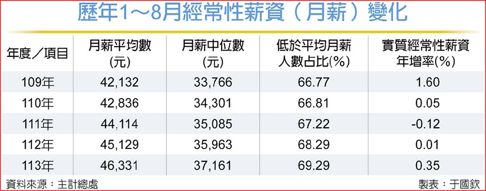 主計總處過去公布的經常性薪資(月薪),都是平均數,上月創編中位數,本月第二次發布,1~8月平均數4.6萬元,中位數3.7萬元,何以兩者差這麼多?譚文玲說,平均數易受高薪族群推升,中位數相對遲鈍,較接近多數人的感受。1~8月有69.3%的受僱者低於平均月薪4.6萬元,為109年有統計以來最高。