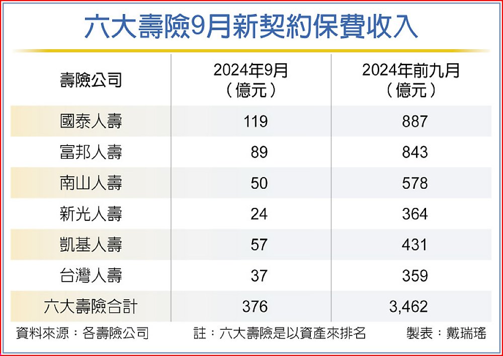 前六大壽險中有五家9月賣贏去年同期,包含國泰、富邦、南山、新光、凱基,其中以國泰人壽年增逾1倍最多,凱基人壽也年增6成。