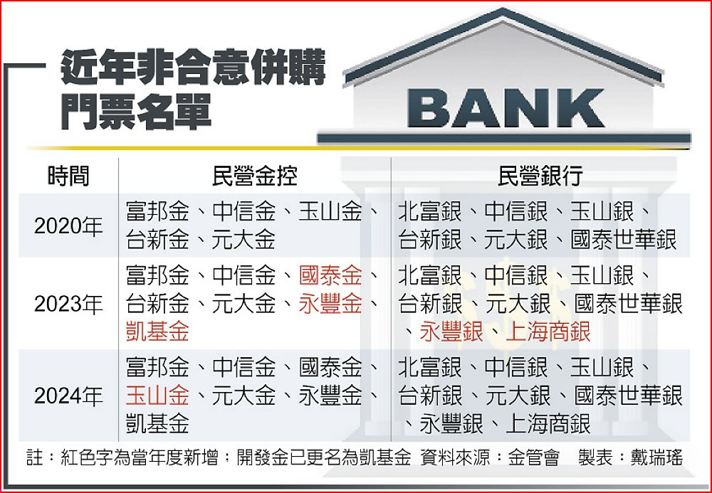 依去年金管會公布的名單,符合非合意併購資格的金控,包含富邦金、中信金、國泰金、台新金、元大金、永豐金、開發金,其中永豐金、凱基金、國泰金是在去年新增進去的,玉山金去年被剔除;銀行名單為北富銀、中信銀、玉山銀、台新銀、元大銀、國泰世華銀、永豐銀、上海商銀,其中永豐銀、上海商銀為去年新增。