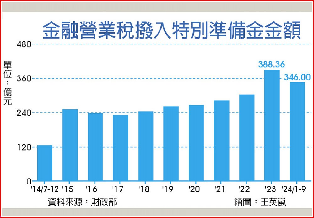 以今年前九月為例,撥入金融業特別準備金的金融營業稅實徵淨額達346億元。明年開始,這筆錢就會和其他金融營業稅一起撥入國庫。