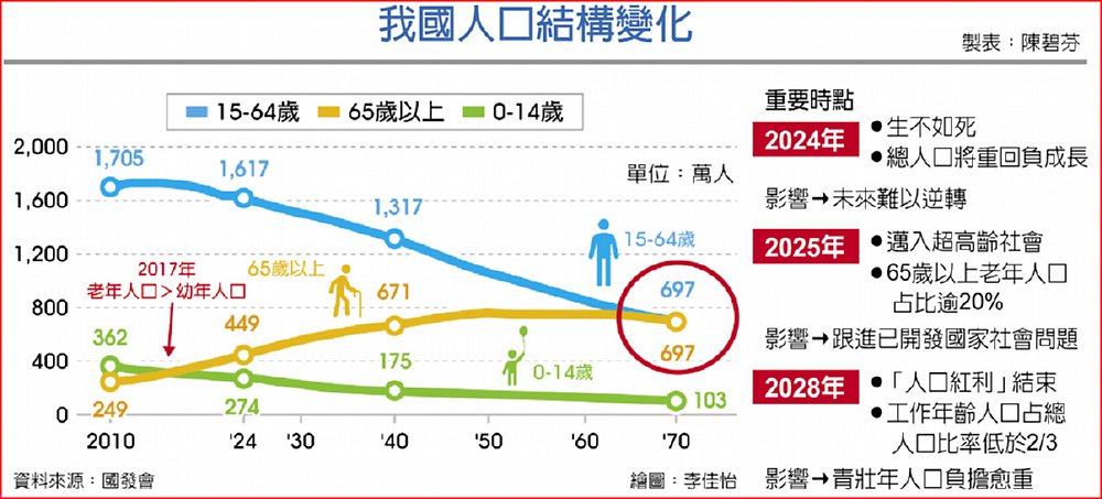 我國總生育率於2023年降至歷史低點的0.865人,僅高於韓國的0.72人,連最早發生超高齡化的日本,2023年總生育率都還有1.20人。國發會說,這將使2024年總人口重回負成長,未來也難以逆轉,2025年我國確定進入「超高齡社會」,人口紅利將於2028年結束。