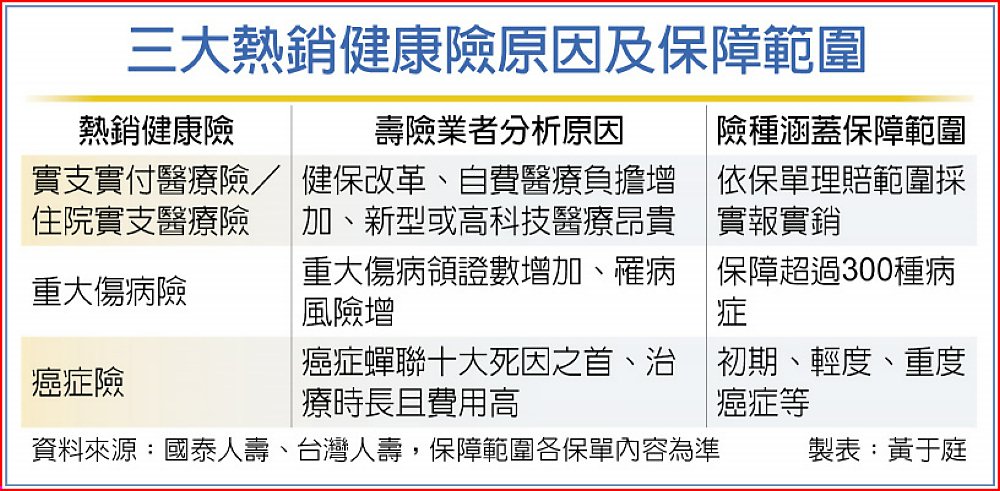 根據國泰人壽觀察,今年1~8月最受歡迎的健康險類型為住院實支醫療險、重大傷病險及癌症險,推估可能與兩大原因有關,一是健保改革導致自費醫療負擔增加,住院實支醫療險便成為民眾醫療保障的投保首選,二是國人重大傷病領證數持續成長、癌症持續蟬聯死因之首,引發民眾保險意識提升。