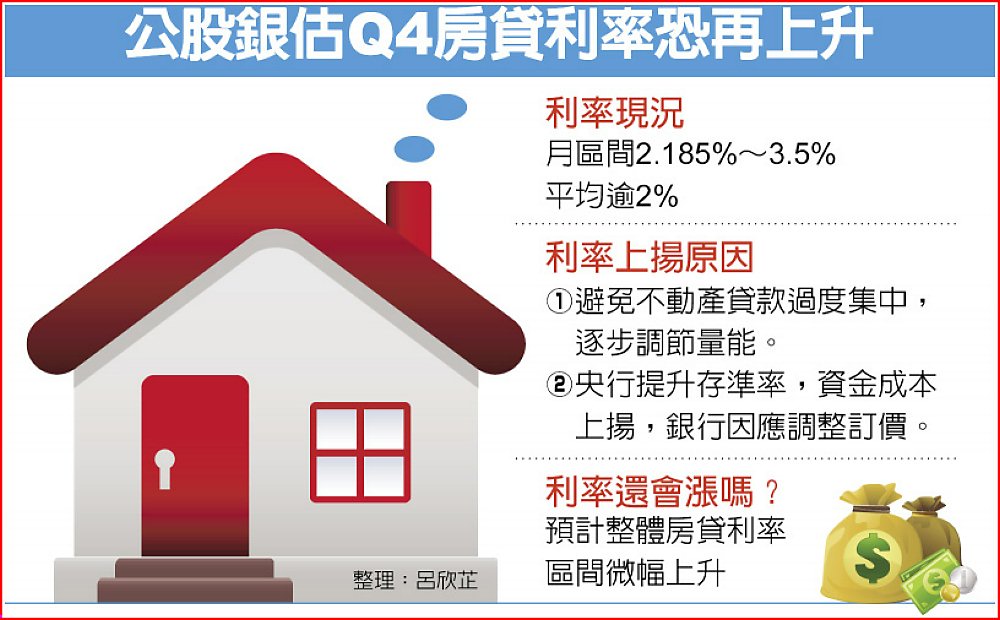 央行欲透過調升存準率收縮資金,對銀行授信產生緊縮效果,成本增加下,不少銀行調整訂價,近期公股銀房貸利率區間明顯較上半年有所調升。