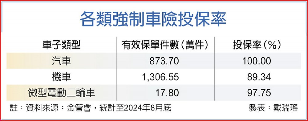 據保險局最新統計,至8月底,汽車的強制車險投保率長年在100%,機車投保率未達90%,但有逐年增加,去年底僅88.47%,至8月底來到89.34%。