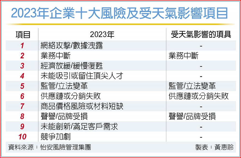 氣候變遷增加自然災害和極端天氣的頻率和嚴重程度,會產生重大經濟和社會影響。Aon集團指出,據Aon的2023年全球風險管理調查,2023年是自2011年來自然災害讓最多人致命一年,如全球多次重大熱浪導致至少16,500人死亡。天氣和氣候讓企業面臨風險,前10名全球風險中四個,即業務中斷、監管和法律變更、供應鏈和分銷失敗及品牌或聲譽損害等,均受天氣影響。