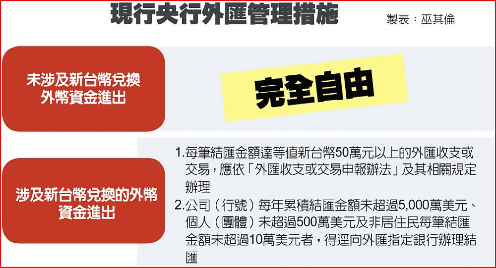 央行副總裁嚴宗大強調,根據央行目前數據顯示,外匯限制並不影響一般操作,且未達額度上限。以台灣經濟體系而言,匯率穩定非常重要,過去幾年保持一大原則,即外幣兌換外幣沒有管制,外幣兌換新台幣在經常帳部分也已完全自由化;金融帳方面也做出很大放寬,若有需要,央行願就個案檢討。