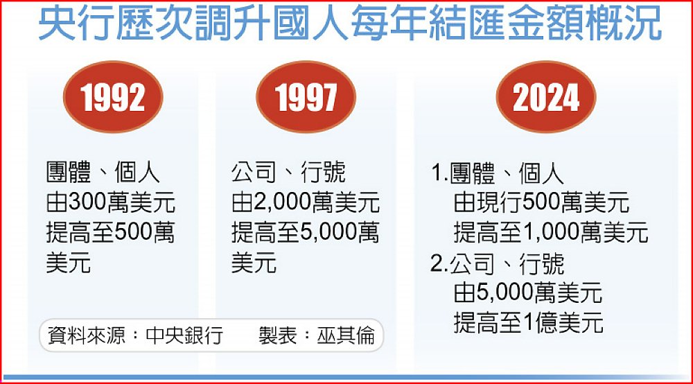 央行外匯局長蔡烱民說明,是否調高結匯一直在滾動檢討,並非臨時倉促決定,過去幾年持續針對規範小幅修正;前次調整結匯金額,個人部分要追溯至1992年,由300萬美元調升為500萬美元,公司是在1997年由2,000萬美元調升為5,000萬美元。