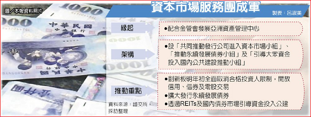 歸納「資本市場服務團」計畫重點,包括:一、創新板明年初全面取消合格投資人限制,開放信用、借券及零股交易。二、透過相關單位等合作的多元管道,尋找潛在案源。三、擴大發行永續發展債券。四、透過REITs及國內債券市場引導大眾資金投入公共建設。
