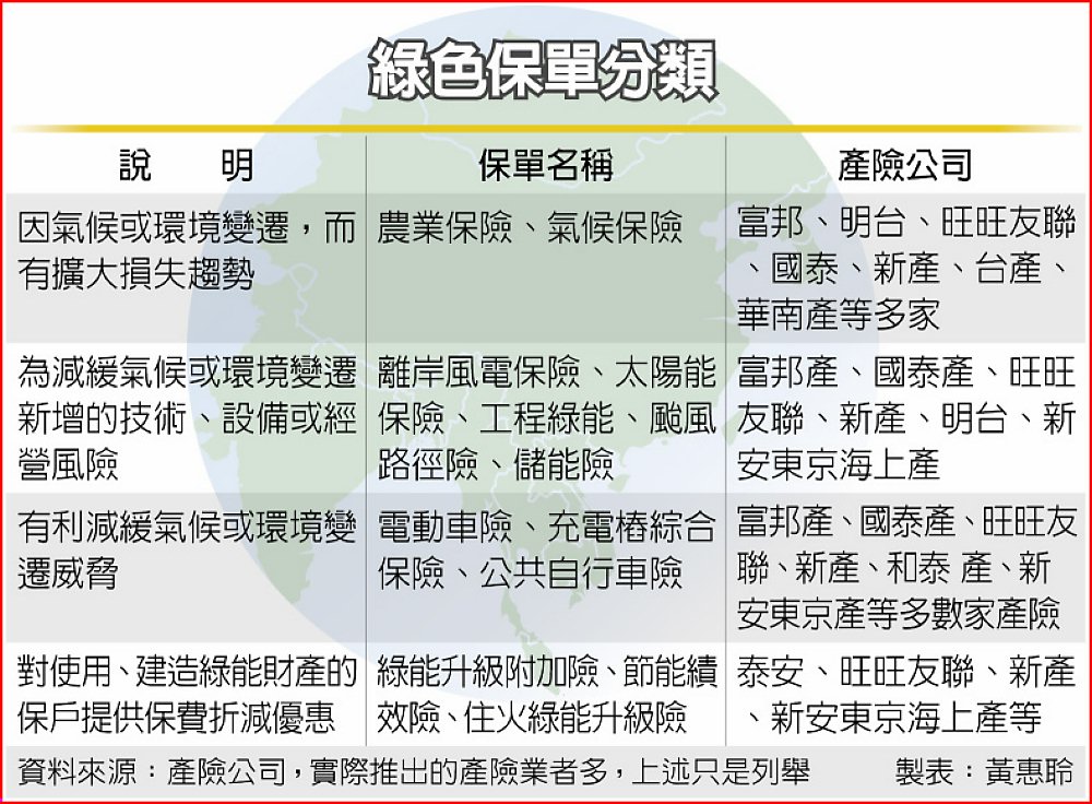 各產險業目前推出的綠色保單包括農業保險、電動車專屬車險、公共自行車險、離岸風電保險、太陽能光電案場;旺旺友聯、台產、南山產險、泰安產險等推出的綠能商品還有「住家綠能升級附加條款」。南山產險表示,主要為鼓勵以綠能建材設備修復或重建住宅保險標的物;泰安產險還有推出能源技術服務業財產及節能績效險等、富邦產險有「安裝工程綜合保險」即為保障風力電場在興建與營運階段風險,還有「電子設備綜合保險」保障太陽能案場風險,此外還推出「颱風路徑保險」,提供離岸風機業者更多保障。