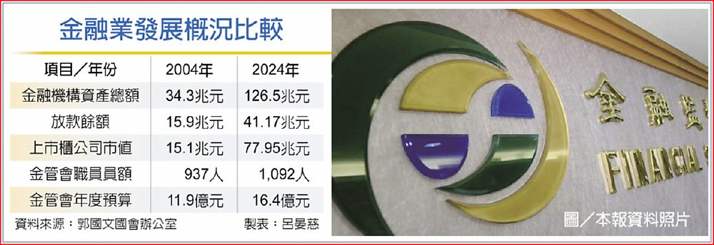 據了解,成立於2004年的金管會,初期年度預算規模約11.9億元,如今成長到16.4億元,但立委質疑,增加的預算多因調薪而來。且同一時間,台灣金融機構資產總額由34.3兆元躍升至126.5兆元,放款餘額也從15.9兆元倍增至41.17兆元,規模明顯擴大,業務面又面臨面對P2P網路借貸平台、虛擬資產服務業、純網銀等新興業務的監理,金管會是否應配合情勢進行改制,提供足夠的人力和資源,來處理日趨複雜的金融業務,已成為當前的重點政務之一。