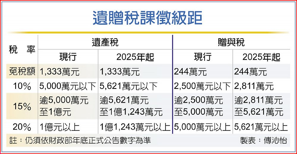 依現行遺贈稅三級制,遺產稅以5千萬元和1億元為分級標準,贈與稅是2,500萬元和5千萬元,三級稅率為10%、15%和20%。明年起贈與稅10%級距提高311萬元至2,811萬元,上限20%的級距擬調高621萬至5,621萬元。