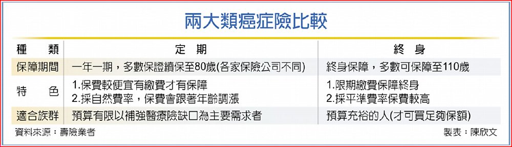 至於預算較充裕的民眾,壽險業者則建議應以罹患癌症就馬上給付或有提供標靶藥物治療保障之相關商品,尤其在醫學快速進步下,最新的精準醫療如免疫療法、標靶治療、質子治療等,因未被列入給付項目而無法獲得理賠,此時保額是否足夠成為投保重點。終身型癌症險雖保費較貴,但繳費期結束後能有終身保障是最大優勢。
