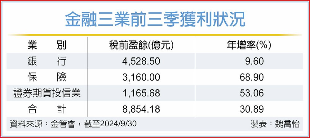 金管會統計,截至9月底銀行、證券期貨投信、保險三業前三季稅前盈餘達8,854.18億元,創同期新高。圖/本報資料照片