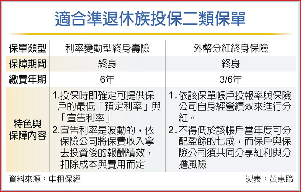 公勝保經事業部經理張雅婷指出,多數的準退休族群很在乎退休後的穩定現金流,建議挑選定期給付還本金或返還一定金額的保單,例如利率變動型終身保險,它不僅提供壽險保障,每年也有機會享增值回饋分享金;也可以選擇分紅保單,參與保險公司的經營成果,每年有機會領到保單分出來的紅利。