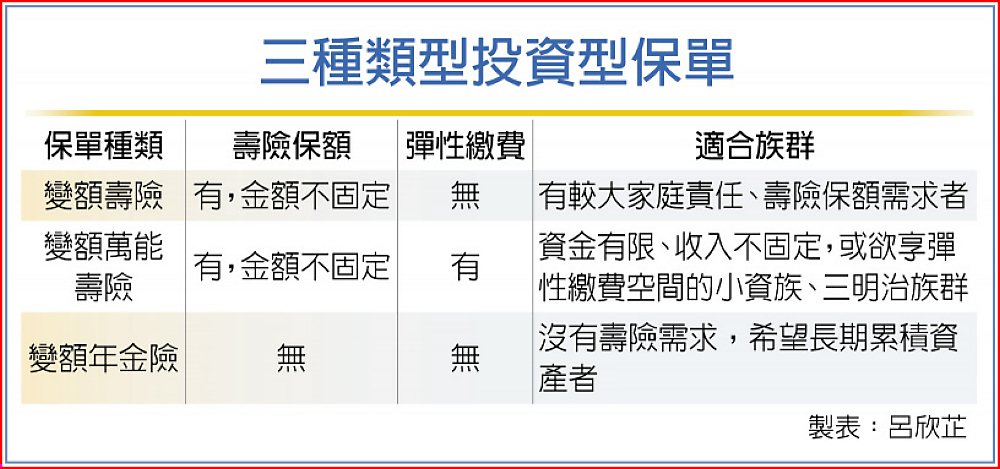 黃雅玲表示,如果有較大的家庭責任、壽險保額需求的人,可選擇變額壽險;一樣是有壽險保額需求者,但資金有限或欲享彈性繳費空間的人,可以選擇變額萬能壽險;如果沒有壽險保障的需求,想實現長期理財的目標,則較適合變額年金險。