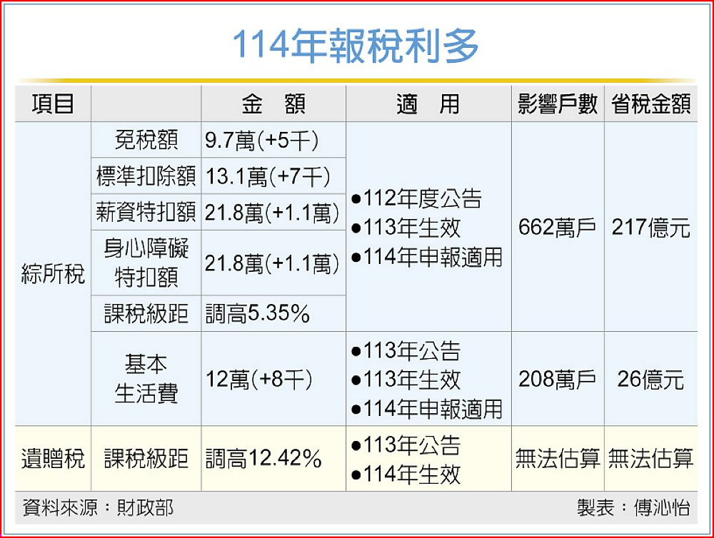 財政部說明,前一年已公告113年度免稅額、標準扣除額、薪資所得特別扣除額、身心障礙特別扣除額及課稅級距金額調整,這部分明年申報時可替民眾省稅金額估算217億元,若加計基本生活費,合計省稅金額上看243億元。
