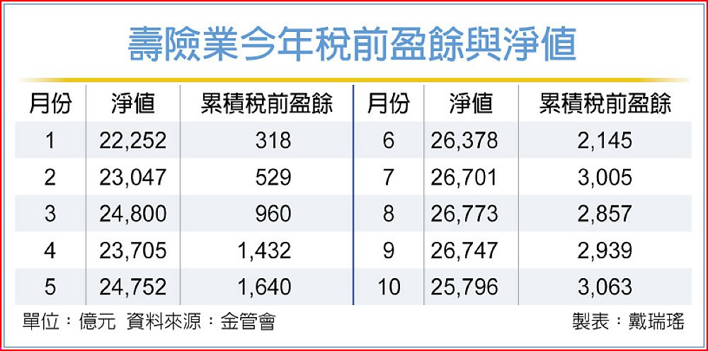 但10月壽險是贏了面子卻輸了裡子,單月淨值大減951億元,為近半年最大減幅,10月底降到2.58兆元,為五個月新低。保險局分析,10月國內外股市波動大,壽險手中股票未實現評價減少794億元,同時美債殖利率10月彈升,導致壽險債券部位評價減損410億元,拖累淨值表現。
