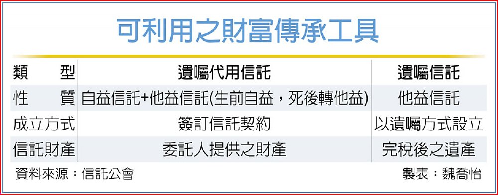 至於「遺囑代用信託」信託公會正積極研擬相關契約條款。信託公會指出,「遺囑代用信託」可同時發揮委託人生前及死後資產管理的雙重功能,也就是委託人可於生前將信託財產用於照顧自己,類似安養信託,委託人死亡後,利用信託財產來支付喪葬費及繳納遺產稅,最後將剩餘的信託財產用來照顧遺族。