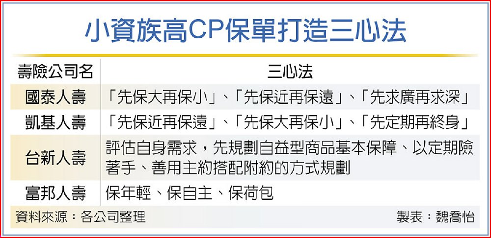 富邦人壽建議,小資族選擇保險商品時,可以低保費高保障的定期險著手,依循「保年輕、保自主、保荷包」三大心法,循序漸進架構適合保障,提醒每月保費預算建議以個人月收入的1/10來規畫。可及早建構醫療、意外和壽險的保障金三角,先選意外險搭配醫療實支實付險,以及一次性給付的重大傷病險,再根據個人自身狀況(如工作性質、家族病史等)規畫其他險種。