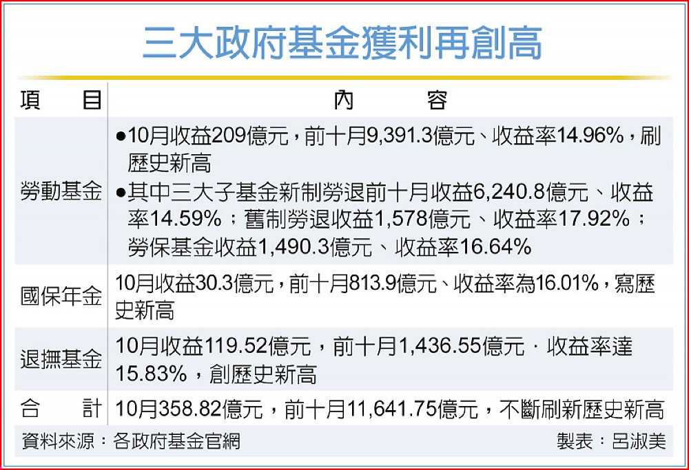 運用局統計,勞動基金加計國保年金及農退基金,總運用規模達7兆5,105億元,截至10月底的評價後收益數為1兆236億元,收益率為15.05%。