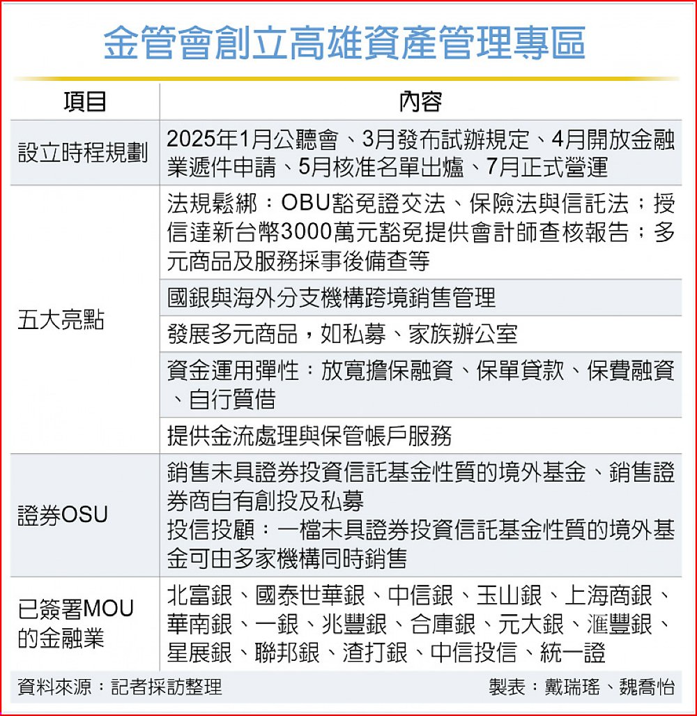 時程上,金管會預計明年1月舉行公聽會,3月發布設立及試辦規定,金融機構可於4月遞件申請,並將在5月公布核准進駐專區與試辦的金融機構,最快7月正式成立開始營運。地點將設立在高雄新創大樓與港滬旅運中心,金融業可租面積超過9500坪,高雄市政府更提出前兩年租金全額補助優惠。