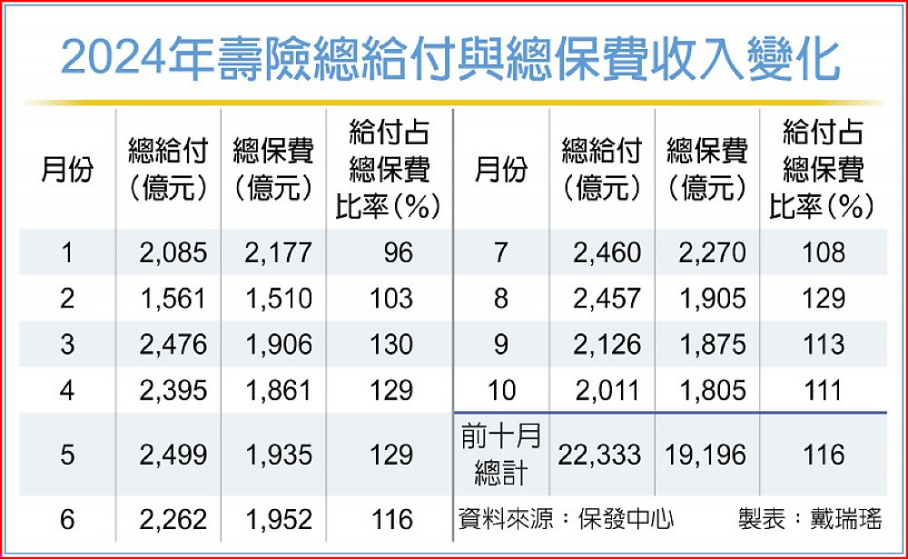 前十月壽險給付來到2.23兆元,為史上同期新高、年增14%,去年前十月給付還未達2兆元,預期今年給付將超過去年史上新高2.4兆元;前十月總保費收入1.92兆元、年增7%,顯示今年保費收入成長跟不上給付的成長速度,累積前十月壽險業務面資金淨流出3,136億元,年增9成。