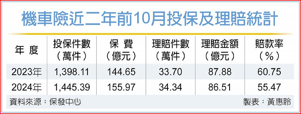 汽機車險保費幾占產險簽單保費近半數,據產險業者資料顯示,前十月汽機車任意險即近944億元,強制險163億元,而前十月機車任意險加強制險保費約156億元、投保件數約144.5萬件,但前十月理賠件數即逾34萬件,理賠金額近87億元,賠款率為55.5%。產險業者表示,近年民眾開進口車比率有增加趨勢,只要發生小小擦撞,維修費用高,因此近年愈來愈多汽、機車族加保第三人責任險還會再投保超額責任險。