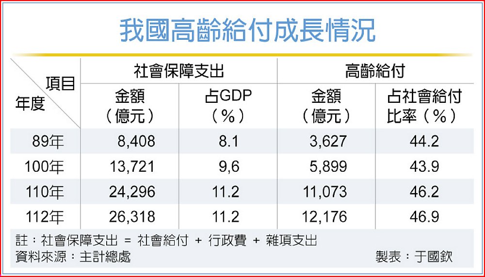 主計總處統計近24年(89~112)高齡給付,由3,627億元升至1兆2,176億元,平均年增率5.4%,比全體社會給付平均年增率5.1%更高,而高齡給付占社會給付的比重也由44.2%升至46.9%。