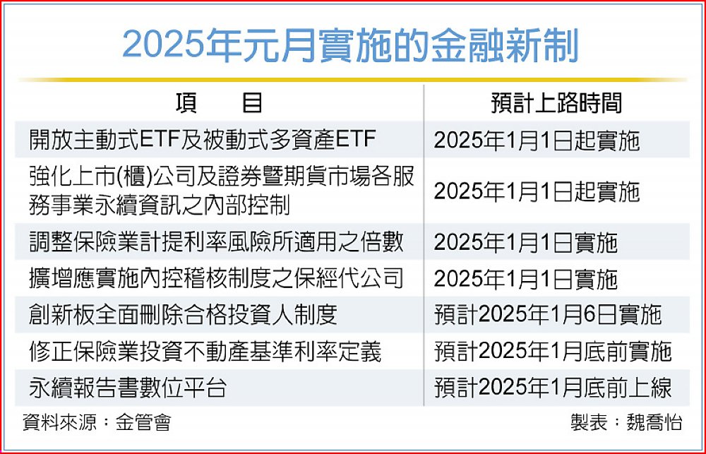 除此,還包括被動式多資產ETF、強化上市(櫃)公司及證券暨期貨市場各服務事業永續資訊之內部控制、調整保險業計提利率風險所適用之倍數、擴增應實施內控稽核制度之保經代公司都在元旦實施,還有創新板取消合格投資人限制等同一般板、永續報告書數位平台上線、修正保險業投資不動產基準利率定義元月上路等措施。