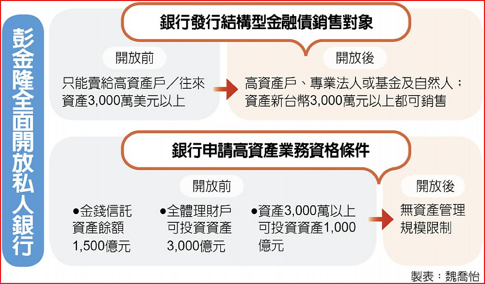 銀行局局長莊琇媛補充,二項放寬均採業者建議,一是放寬銀行發行結構型金融債券銷售對象,也就是銀行在國內外發行的結構型金融債券只能賣給「高資產客戶」即往來資產達3,000萬美元以上的億級客戶,開放到專業投資人的法人或基金及自然人、即資產新台幣3,000萬元至5,000萬元者也能銷售。