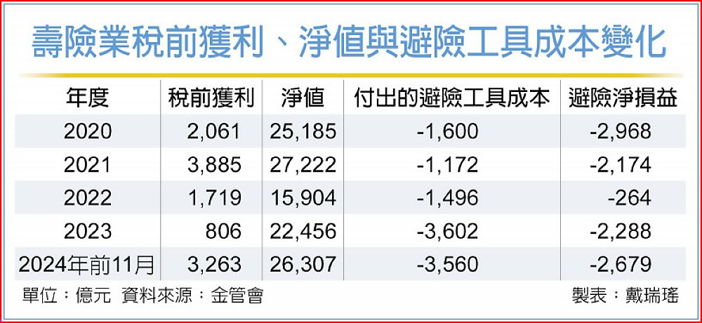 不過,壽險業2024年仍飽受避險成本所苦,雖11月傳統避險工具成本稍微下降,但預期2024年全年壽險所付出去的避險工具成本將在3,800億元左右,續創史上新高,且這筆錢是付出去就一去不回。