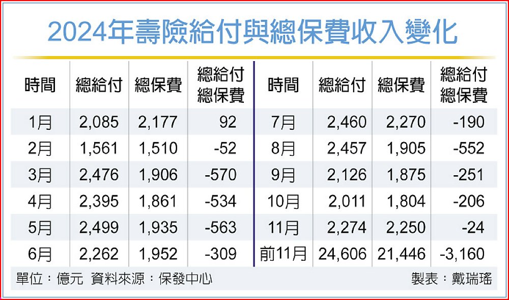 前11月壽險累積給付達2兆4,606億元、年增約為13%,已經超過2023年全年的2兆4,054億元,其中以解約金增加最多,預估2024年全年給付會在2.6兆元左右,創下史上新高;前11月總保費收入2兆1,446億元、年增8.8%,但總保費收入成長速度仍跟不上給付成長速度,前11月壽險業務面資金約淨流出3,160億元,超過2023年全年的2,175億元。