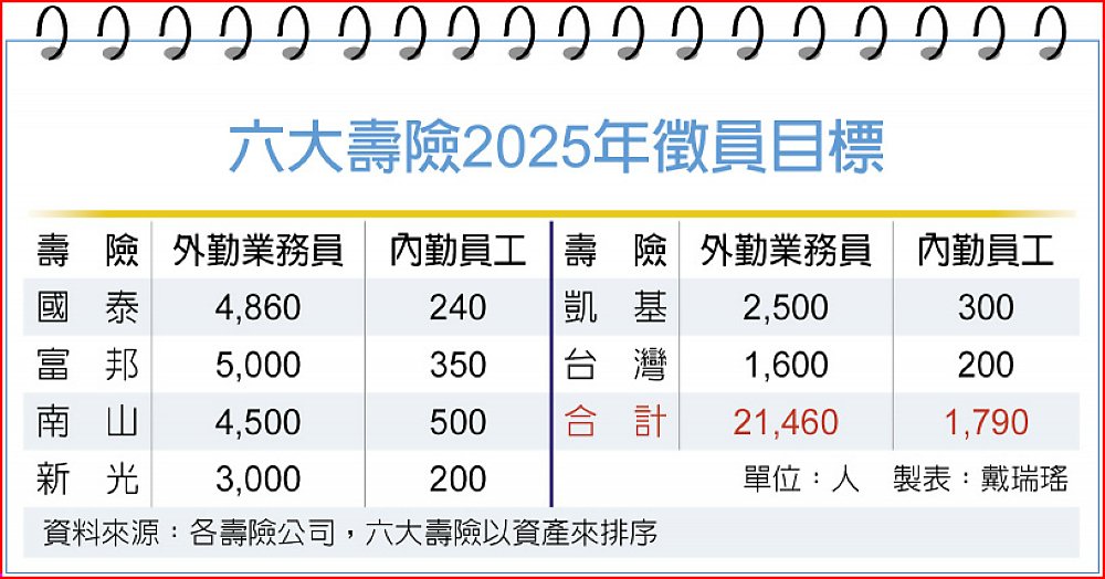 六大壽險今年卯足全力徵員,外勤業務員開出目標共2萬1,460名,其中富邦人壽5,000人最多。圖/本報資料照片