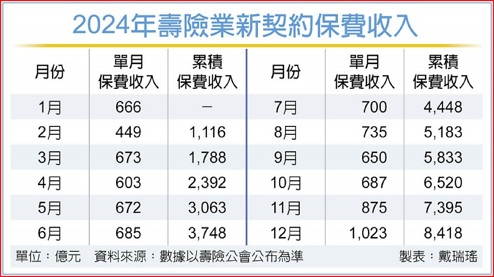就去年全年來看,壽險新契約保費收入8,418億元、年增25%,2023年全年6,714億元,去年有兩個月賣破800億元,即12月的1,023億元,與11月的875億元,顯示去年壽險新契約保費飆三年新高,最後兩個月業績是最大功臣。