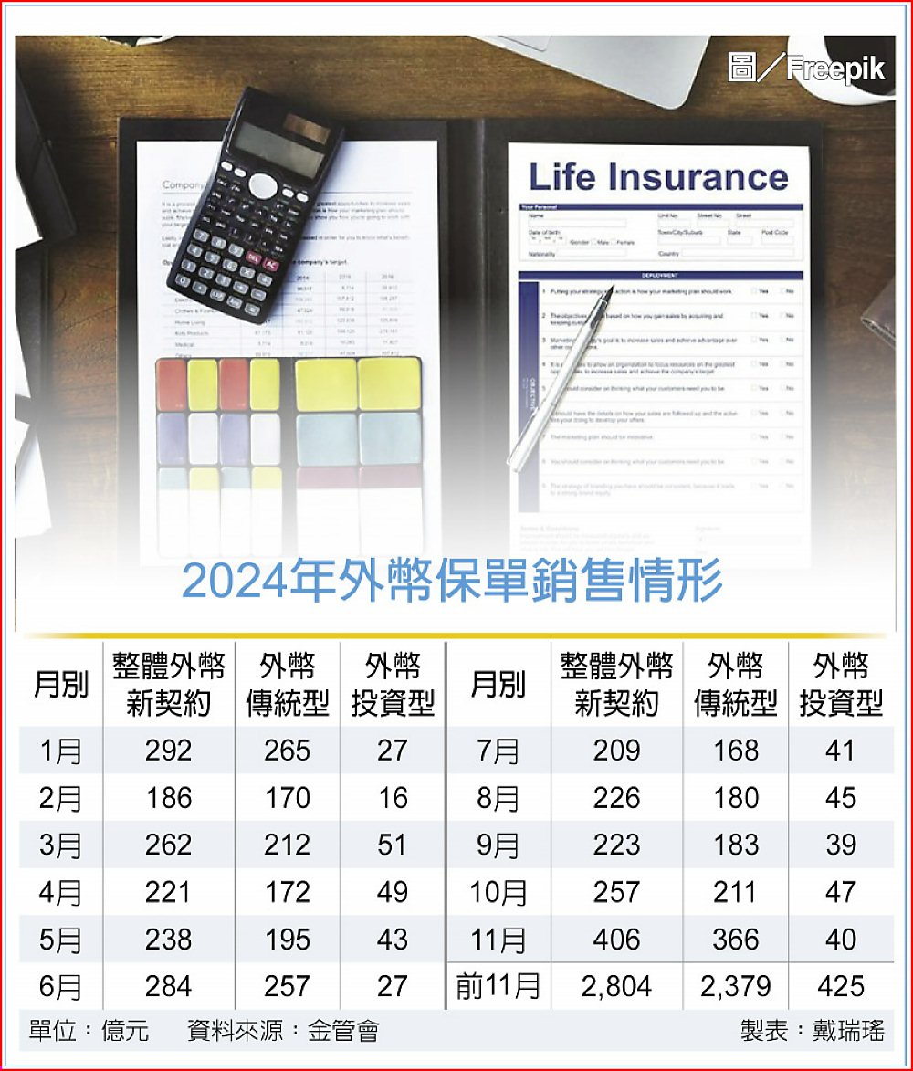 去年前11月外幣保單銷售2,804億元、年增15%,主要是外幣傳統型保單帶動,前11月賣2,379億元、年成長29%;反觀投資型保單持續低迷,前11月僅賣425億元、年減達29%。過去外幣保單約占壽險新契約保費5成~6成,但去年前11月占比僅37.93%,創2019年正式統計以來新低,顯示保戶相對較偏好買新台幣保單。