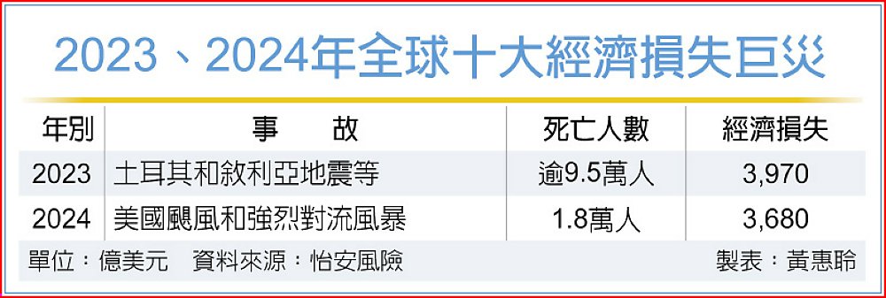 調查顯示,2024年全球最具破壞性的事件是颶風海倫,去年9月在美國登陸,造成750億美元的經濟損失並導致243人死亡,緊隨其後的是去年10月的颶風米爾頓,其為全球單一保險損失事件中最昂貴的一次,損失高達200億美元,這些災難性事件是美國占全球保險損失78%的主因。