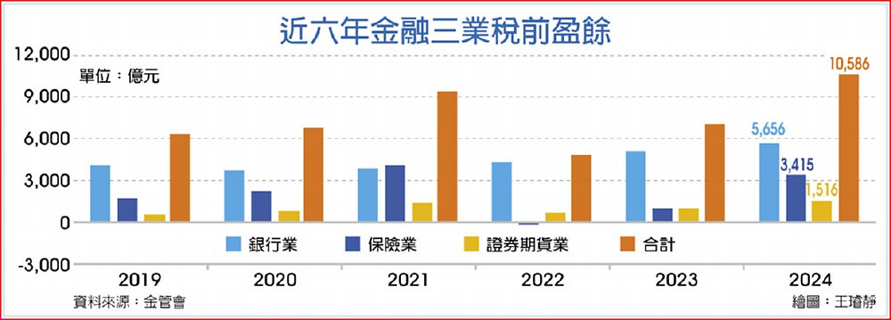 金融三業去年稅前盈餘年增3,546億元或50.36%,銀行業貢獻超過5成、大賺5,656億元並創歷年最高,年增達589億元或12%。其中9成來自本國銀行、年賺5,273億元,年增549億元或11.6%,更是首度賺超過5,000億元大關。