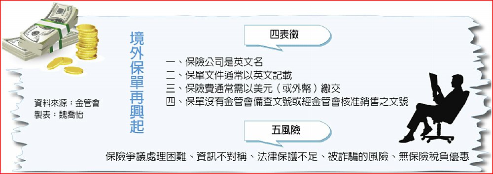 金管會保險局副局長蔡火炎說,境外保單主要有「投資型保單」、「分紅保單」二大宗,且多以美元計價為主,常見的銷售境外保險商品態樣,有假借資產管理公司或財務顧問等公司名義,透過社群平台推介招攬未經主管機關核准的境外保險商品,多以「保費較國內保單低、可長期投資,獲利良好」等話術推銷。