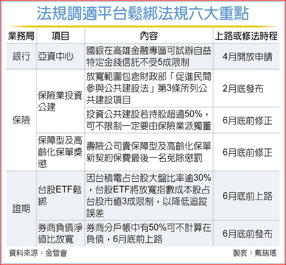 六大法規鬆綁包括:一、銀行在高雄金融專區,可試辦自益特定金錢信託質借不受5成限制,4月將開放13家銀行申請;二、台股ETF將放寬限制以降低追蹤誤差;三、券商分戶帳鬆綁;四、保險業投資公共建設相關鬆綁;五、保險業投資公建納入財政部促參範圍,2月底前上路;六、保險公司賣保障型及高齡化保單最後一名刪除懲罰。