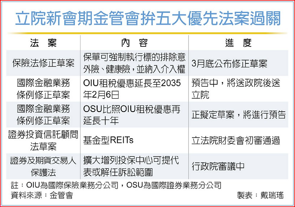 針對亞資中心,保險局、證期局希望OIU、OSU稅負優惠再延10年。OIU租稅優惠2月6日已落日,金管會公告修法草案再延長10年、至2035年2月6日,正進行預告中,將送政院後再送立院審議,通過後可回溯至今年2月6日適用;OSU租稅優惠2028年底落日,將比照OIU再延長10年;基金型REITs「證券投資信託及顧問法」初審已過,本會期拚三讀通過;投保法修正,擴大增列投保中心可提代表或解任訴訟範圍,強化投資人保護。