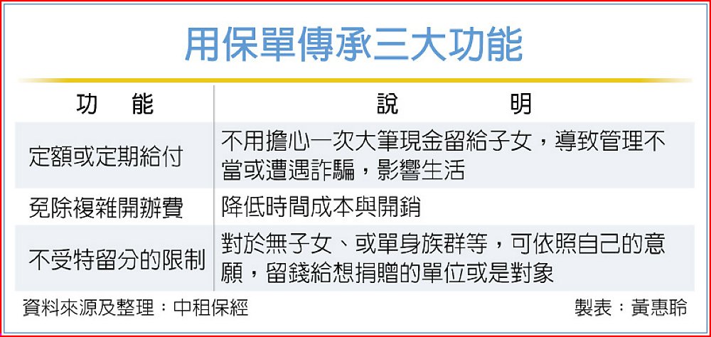 保險業者指出,保險理賠金的給付通常不經遺產清算程序,能確保資產傳承的隱私性與安全性。個人以壽險作規劃時,可依當時的財務狀況選擇適當的保險額度,填寫受益人並且定期檢視與調整保單,隨著人生階段變化,適時調整保險規劃以符合當前需求。除了保險,還可透過信託與遺囑等法律工具可進一步確保財產有效分配。