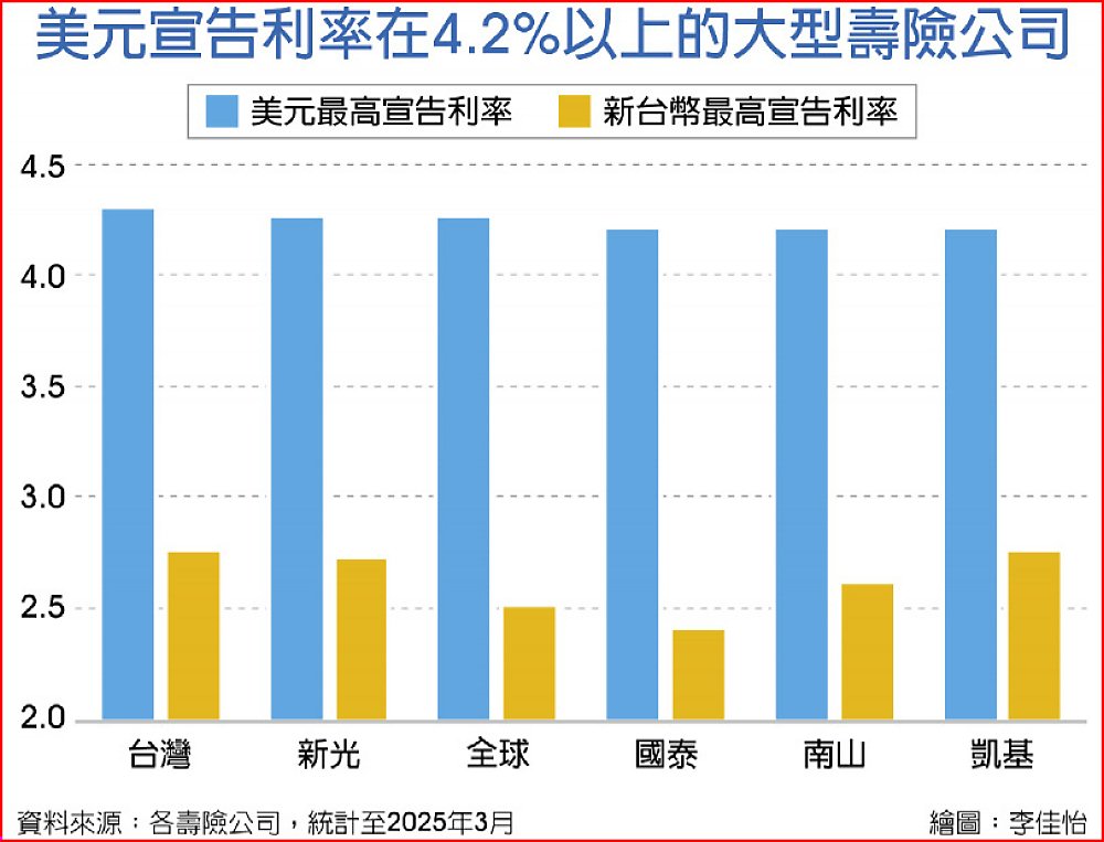 統計今年來至3月,六家大型壽險將美元宣告利率拉升到4.2%以上,目前以台灣人壽4.3%暫居市場最高。
